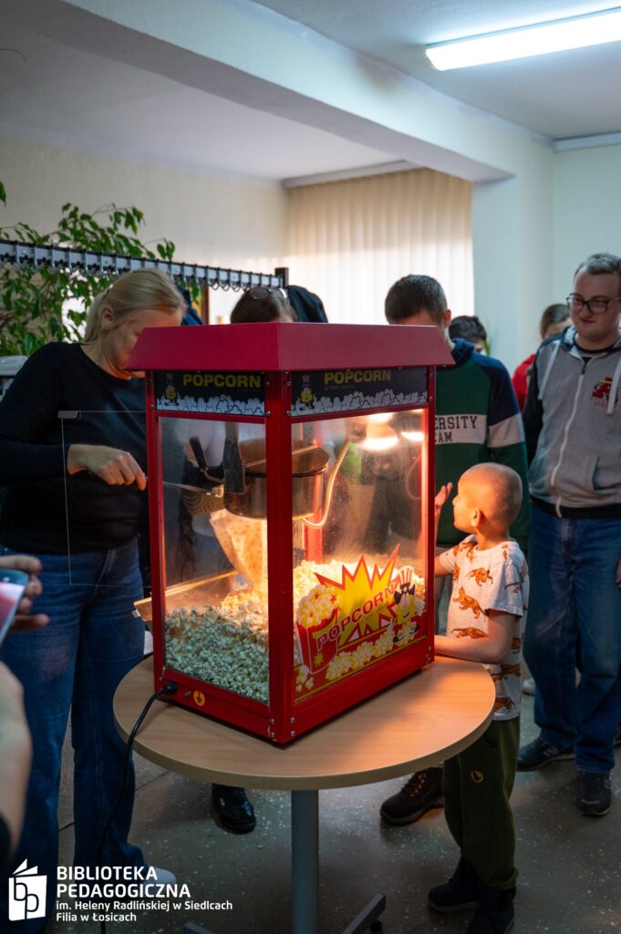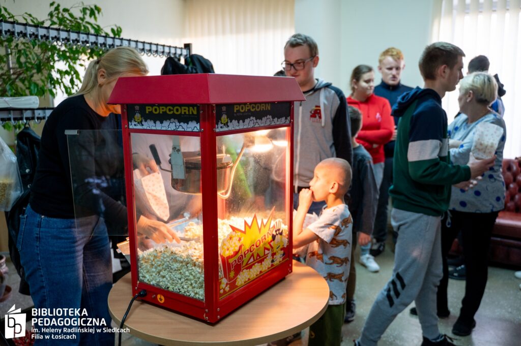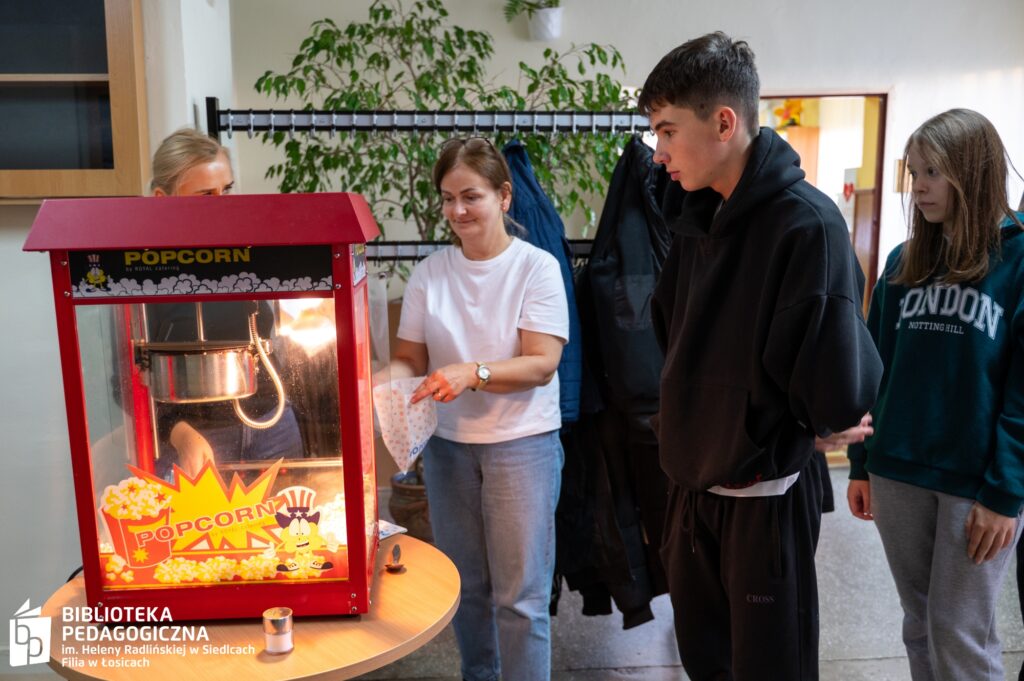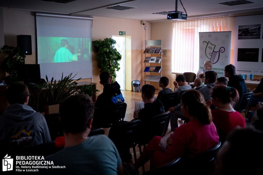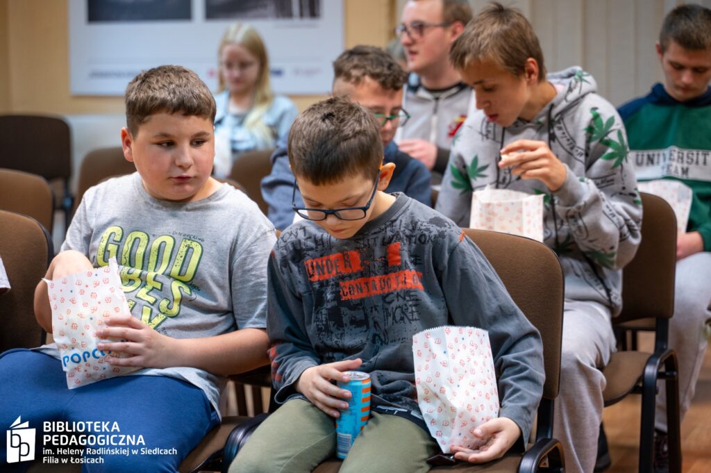 Zwieńczeniem intelektualnej rozgrywki był filmowy finał. Sala Biblioteki Pedagogicznej w Łosicach, na co dzień przestrzeń edukacyjna, tego wieczoru przeobraziła się w nastrojowe kino. Po zgaszeniu świateł na ekranie zagościł film, a towarzyszący seansowi popcorn i słodkie poczęstunki dopełniły atmosfery zasłużonego relaksu po wykonanej misji.