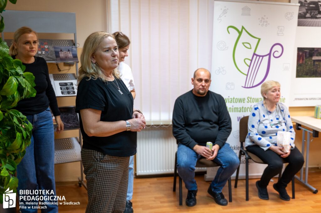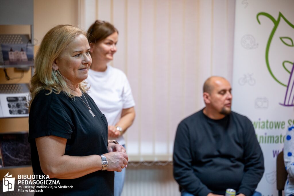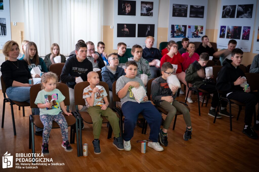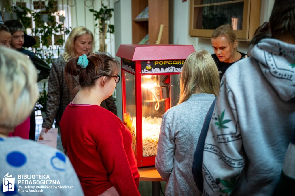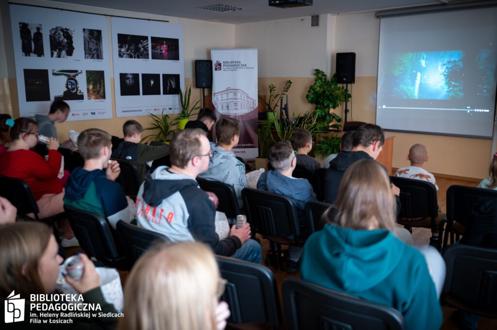 Zwieńczeniem intelektualnej rozgrywki był filmowy finał. Sala Biblioteki Pedagogicznej w Łosicach, na co dzień przestrzeń edukacyjna, tego wieczoru przeobraziła się w nastrojowe kino. Po zgaszeniu świateł na ekranie zagościł film, a towarzyszący seansowi popcorn i słodkie poczęstunki dopełniły atmosfery zasłużonego relaksu po wykonanej misji.